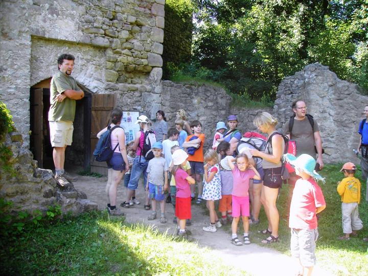 Opravy hradních zdí (míchačka, kolečka, lešení, kameny, lžíce, fanka...)