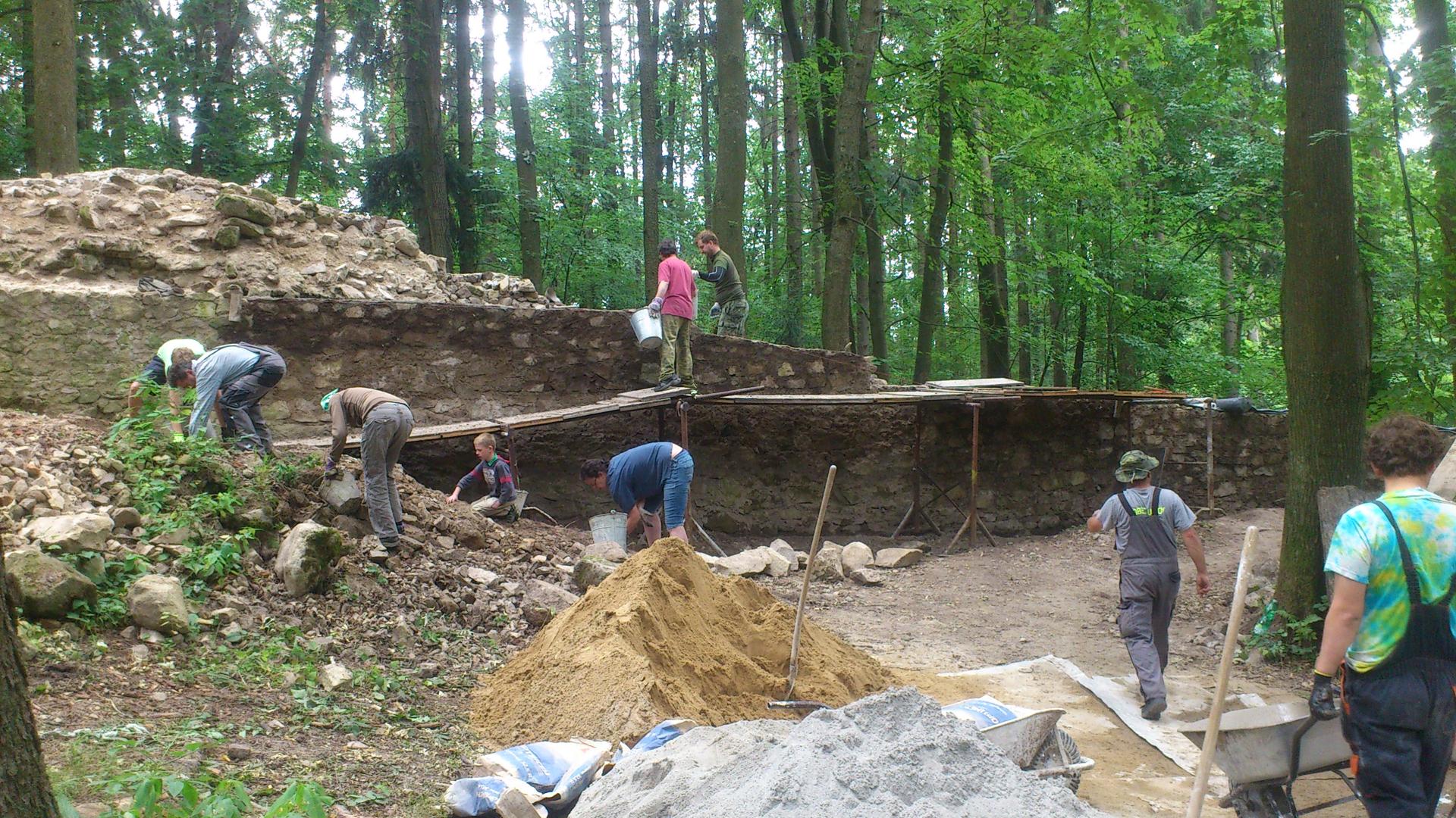 Oprava hradních zdí (míchačka, kolečka, kameny, lžíce a fanka) a čištění jejich základů (krumpáč, lopata, motyčka, smetáček).